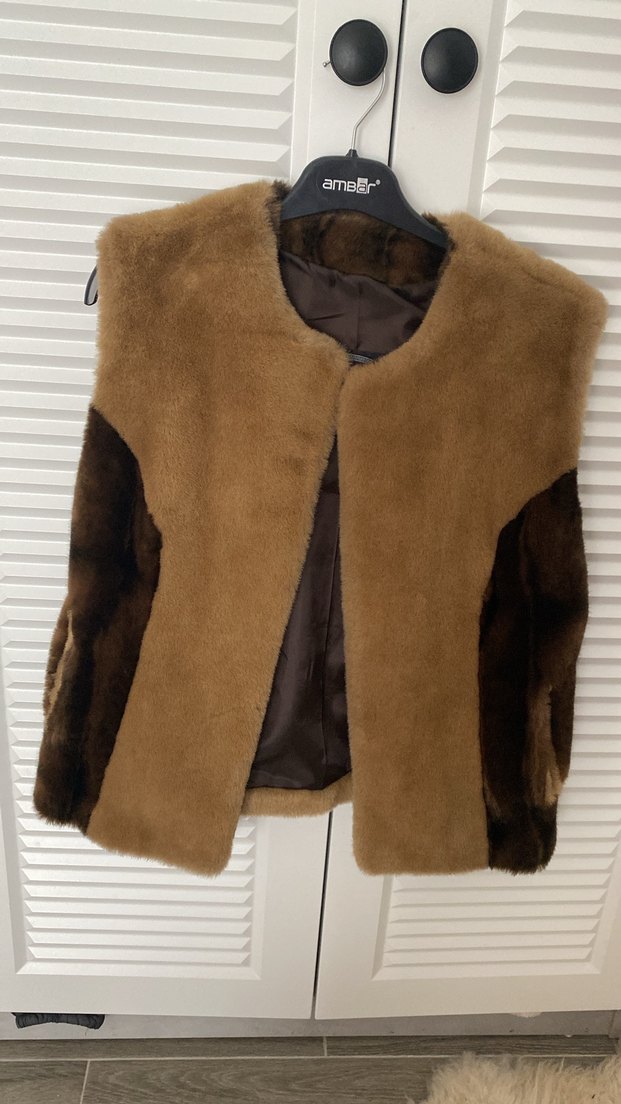 36-38 bedene uygun Fitted kahverengi süet yelek, ön ve yanlarda kürk detaylıdır. Kolsuz, straplez yakalı ve midi uzunluktadır. Günlük şık ve rahat sokak stili için uygundur.
