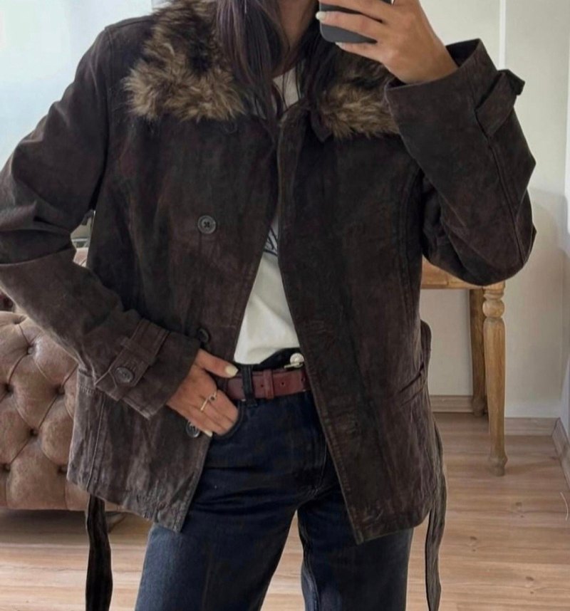 Vintage Kahverengi Kürklü Süet Kadın Deri Ceket