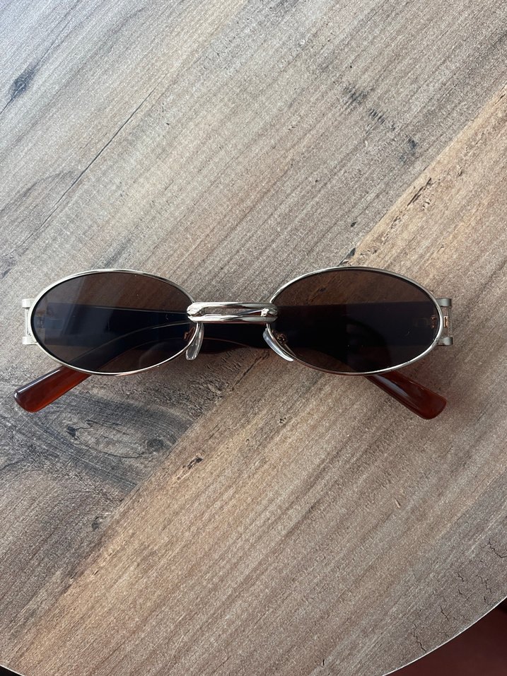 Oval lensli, tokalı tasarıma sahip kahverengi vintage kadın güneş gözlüğü. Gri tonlarında çerçevesiyle retro bohem tarzı sunar. ️