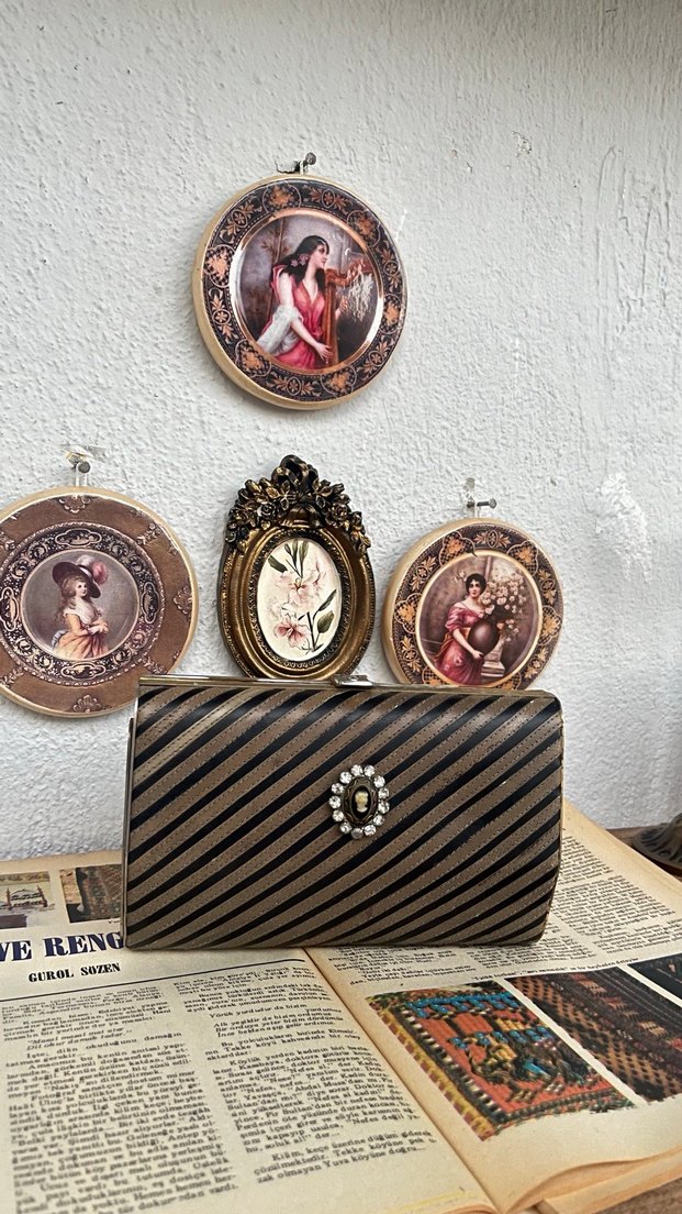 Kahverengi deri, zebra desenli, tokalı vintage tarz clutch. Günlük kullanıma uygun klasik şıklık sunar.