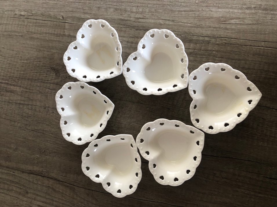 Narin kesim detaylara sahip vintage tarzda beyaz kalp şekilli tabak seti, küçük ikramlar için uygundur. ️