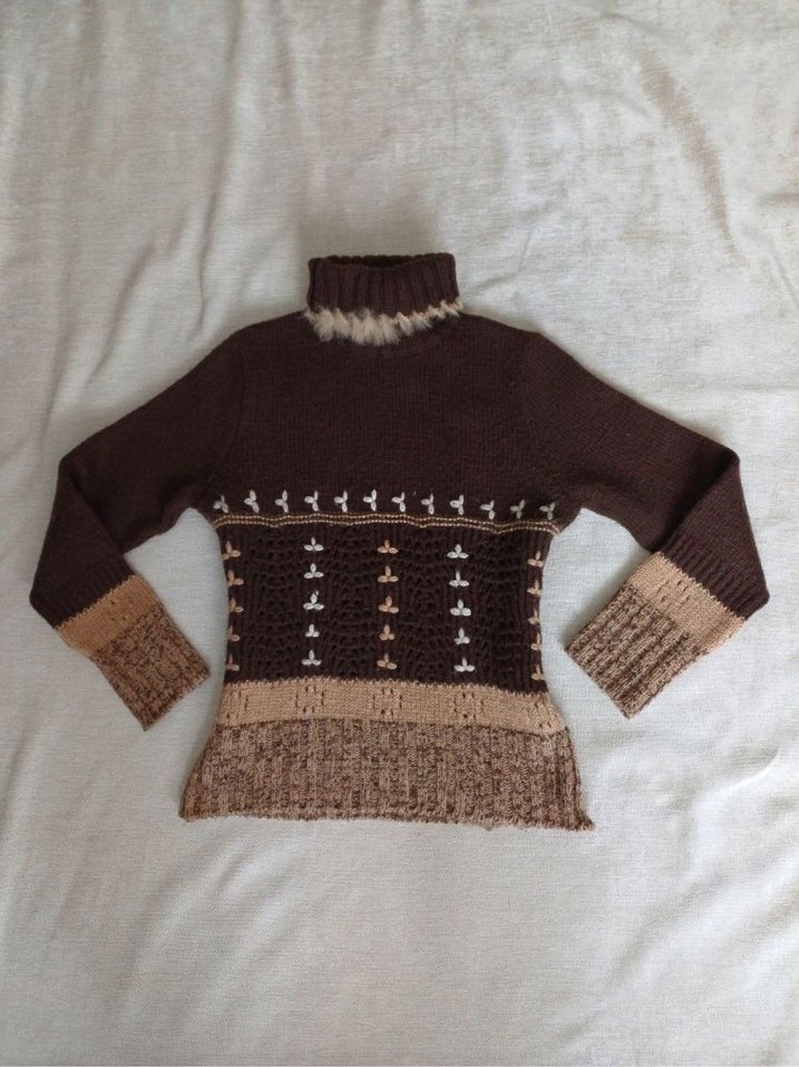 Fitted kesim, boğazlı ve uzun kollu bu bohem kazak, yumuşak örgü kumaştan yapılmıştır. Koyu kahverengi ve bej tonlarında, gündelik kullanıma uygun rahat bir tasarımdır.