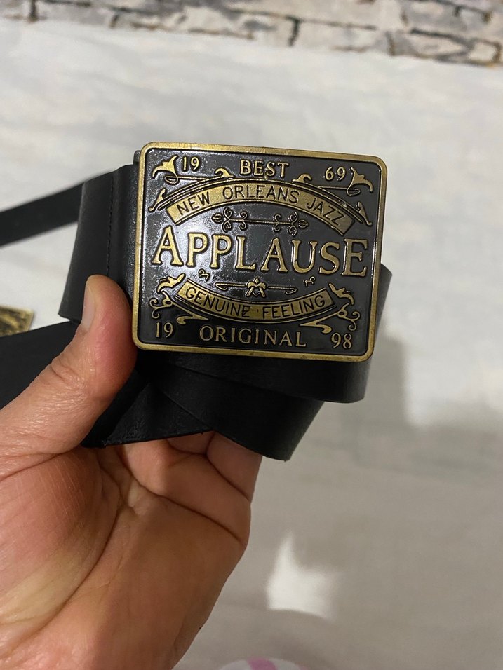 Kadınlar için koyu renk deri kemer, altın tonlu vintage tokası üzerinde "APPLAUSE" ve "NEW ORLEANS JAZZ" yazıları bulunur. Tokalı, kontrkültür tarzında.toka fiyatıdır unisex uygundur kemerle gönderim yapacağım kemerleri yıpranmıştır kemerle gönderim yapacağım