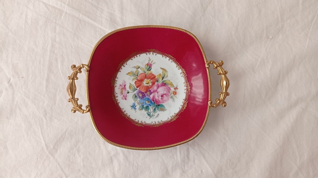 Vintage kırmızı tabak, renkli çiçek desenleri ve dekoratif altın sap ile sofranıza şıklık katıyor.