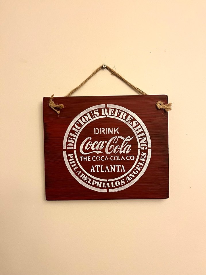 Kırmızı renkte, nostaljik Coca-Cola logosu ve Atlanta yazılı ahşap tablo. İp askısıyla asılabilir.