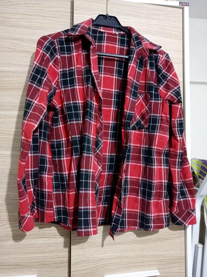 Koyu kırmızı ekose desenli, düğmeli ve yakalı kadın gömleği. Uzun kollu, bol ve midi boyda, yumuşak kumaştan günlük rahat kullanım için uygun.