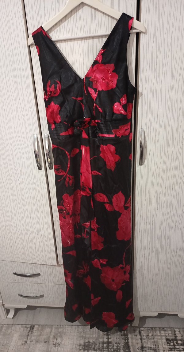Vintage Kırmızı Siyah V Yaka Uzun Abiye Elbise