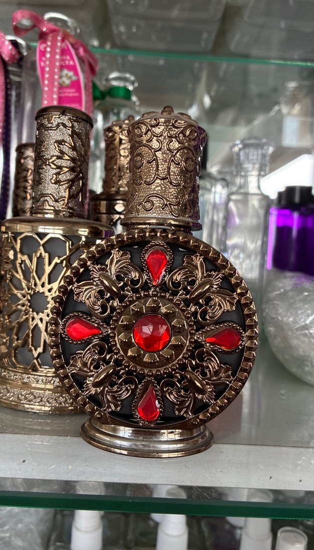 Kadın parfüm şişesi, kırmızı taş detayları ve ince işçilikle süslenmiş vintage tasarıma sahiptir.