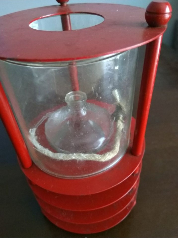 Koyu kırmızı metal iskelet ve silindirik cam haznede fitilli mumluk. Üst ve alt dairesel tasarım içerir. ️Cam hazneli, metal çerçeveli dekoratif yağ lambası. İçinde fitili duruyor. İster zeytinyağı ya da gazyağı ile çalıştırılabilir, ister dekoratif amaçla kullanılabilir. Temiz ve sağlam. Retro severler için güzel bir parça.