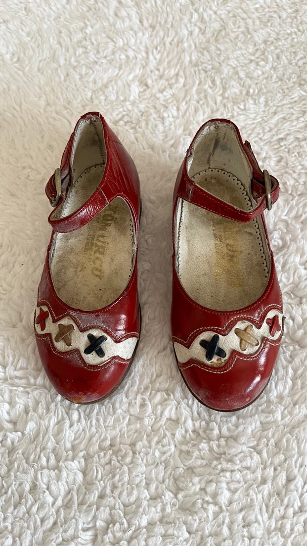 Vintage 90’lar Kız Çocuk Ayakkabısı – Koleksiyonluk 90’lı yıllardan kalma, tamamen orijinal kırmızı vintage kız çocuk ayakkabısı. Tokalı model, üst kısmında dönemine özgü renkli işlemeler bulunmaktadır. Koleksiyoncular, dekor amaçlı kullananlar veya vintage çekimlerde değerlendirmek isteyenler için çok ideal. Kullanıma bağlı yaşanmışlık izleri mevcut fakat genel olarak sağlam durumdadır. (Fotoğraflarda detaylı görebilirsiniz.) Numara: Tahmini 23–24 (iç taban ölçüsü isterseniz ölçüp yazabilirim) Nadir bulunan bir parça. İlgilenenlere hemen kargolanır. Parlak kırmızı kauçuk malzemeden, tokalı ve nakışlı klasik kız çocuk babet ayakkabısı.