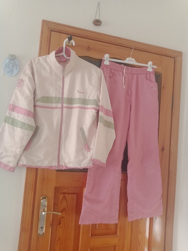 Rahat kesim, fermuarlı ceket ve düz pantolondan oluşan pastel pembe kız eşofman takımı. Notched lapel yaka ve askılı kol detaylı.