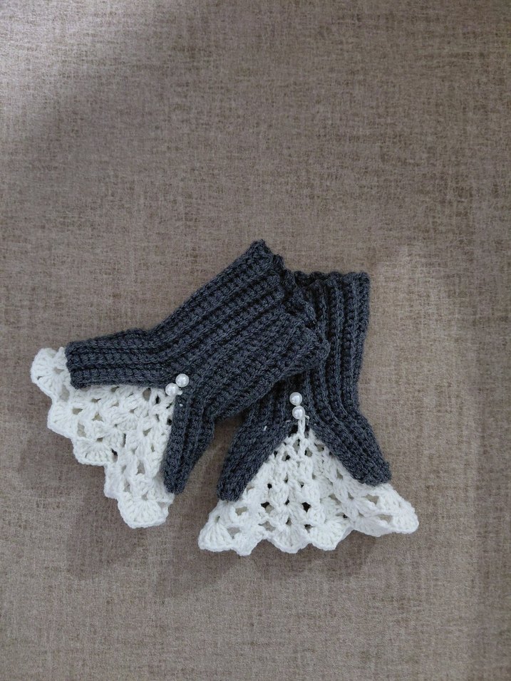 Gri örgü kadın eldivenleri, beyaz dantel ve inci detaylarıyla gotik ve rahat bir tarz sunar. Parmaksız tasarımıyla nostaljik bir hava yaratır.