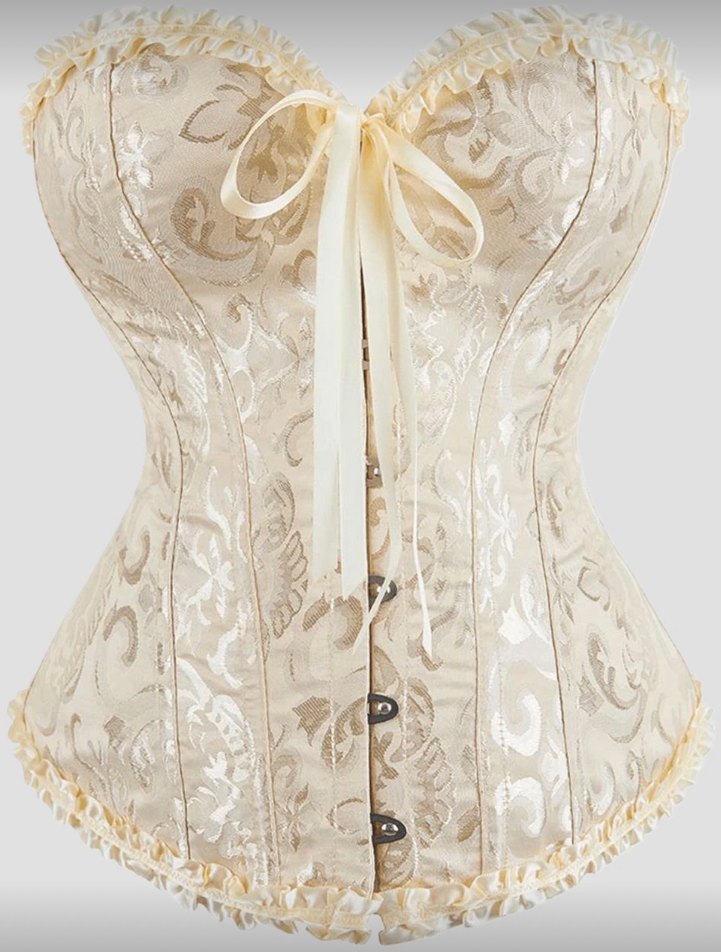 Nakışlı dantel detaylı, beyaz straplez ve askılı kollu, klasik ve vintage stilinde, düğünler için uygun bustiyer. Midi boyda, vücuda oturan kesim.