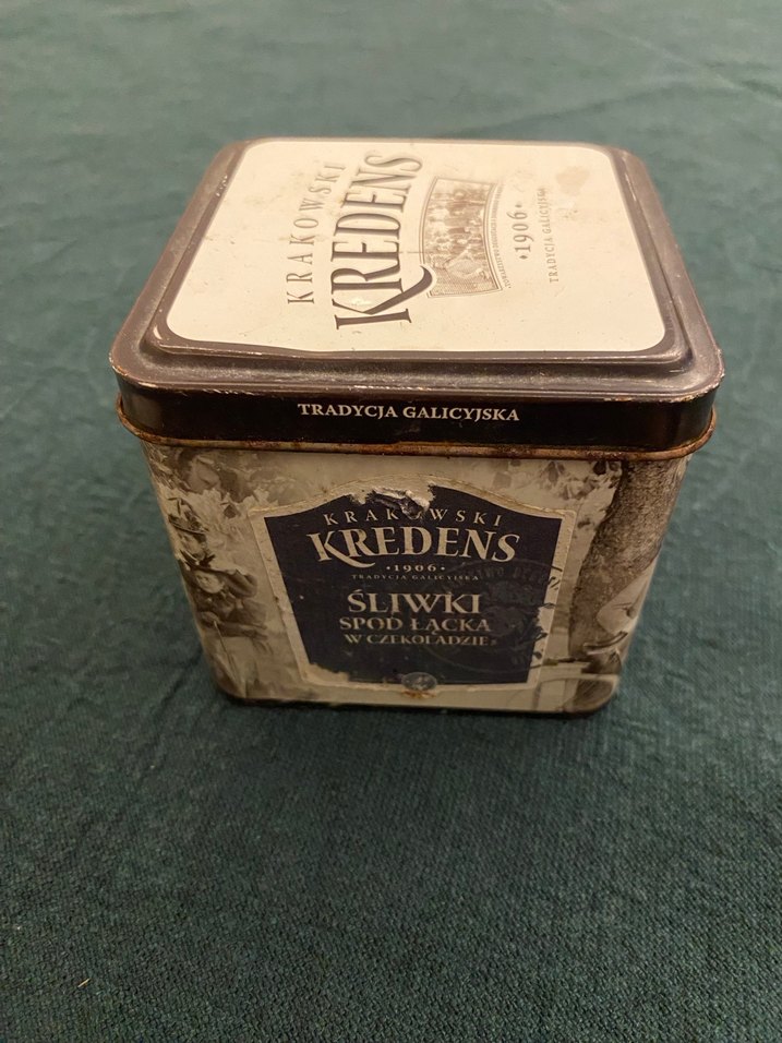 Krakowski Kredens markasına ait, parlak kahverengi metal gıda kabı, geleneksel Polonya tasarımına sahip ve üzeri şeftali (śliwki) yazılıdır.