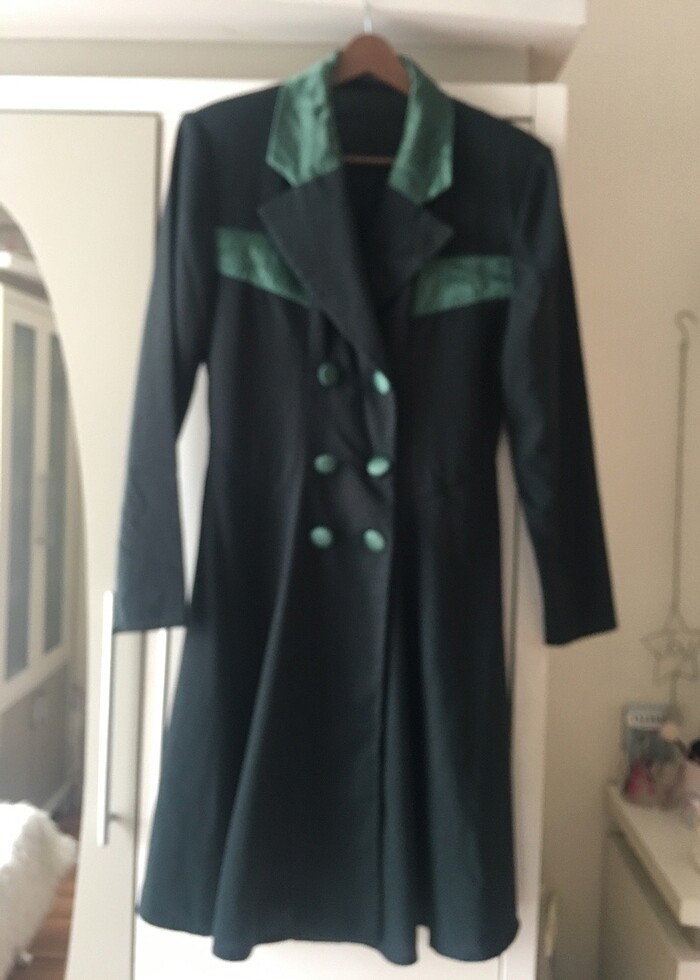 Temiz kullanılmış vintage bir elbise şahane krep kumaştan yakası bağcıklarıve cep kapakları saten kumaştan kurveze belden itibaren parçalı kloş model diz üstü boyunda