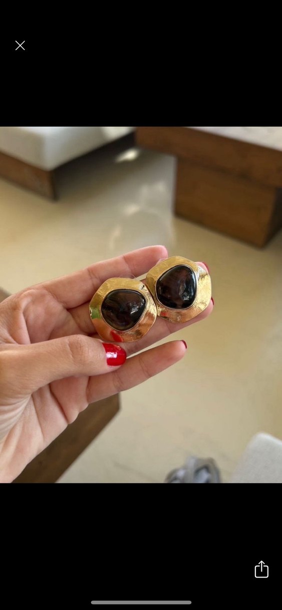 Altın tonlu vintage düğmeli küpeler, koyu yılan desenli detaylı, kısa boyda, romantik akşamlar için uygun.