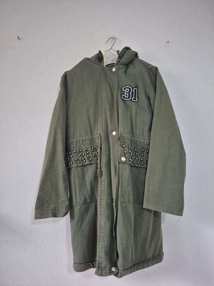 Nakışlı detaylara ve düğmeli kapamaya sahip, uzun ve gri-yeşil tonlarında kadın ceket. Uzun kollu, bol kesim ve notched yaka ile sokak stili için uygundur. Cep kısmında metal süslemeler ve göğüste 31 nakışı bulunur.