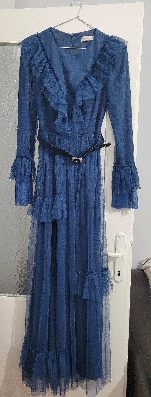 Vintage tarzı, fitted kesim uzun lacivert elbise, fırfırlı detaylar ve yakada kesimli yaka içerir. Nakışlı kumaşı ve gotik-avant-garde havası ile düğün için uygundur.
