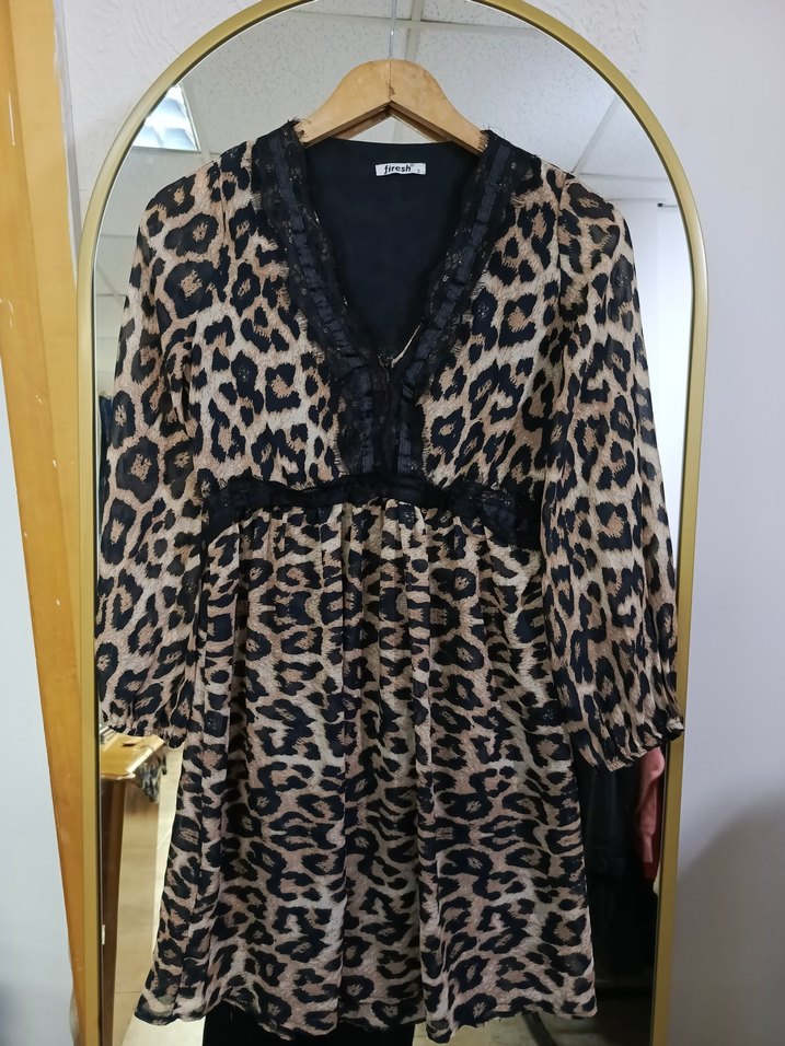 vintage Leopar Desenli Dantel Detaylı mini elbise Firesh marka, hiç eskimeyen leopar desenli, çok zarif bir elbise. S bedendir. Kumaş Özelliği: Ürün tül gibi ince ve şeffaf bir yapıdadır, iç gösterir. Bu yüzden içine astar, büstiyer veya uygun renkte bir kombin parçasıyla giyilmesi önerilir. Detaylar: V yaka kısmında ve belinde siyah dantel işlemeleri mevcuttur. Kolları uzun ve uçları lastiklidir. Kullanım: Gece şıklığı veya özel davetler için çok iddialı ve şık bir parçadır. sporlaştırıp günlük kombine uygun şekilde de giyebilirsiniz Ürün fotoğraflarda görüldüğü gibi temiz durumdadır. Şeffaf dokusunu yakından çekip ekledim, lütfen inceleyiniz.