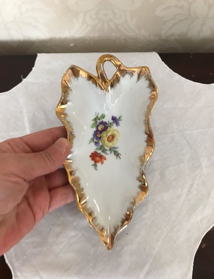 Vintage limoges el boyama farklı formu ve çiçek desenleri ile çok şık sunumluk. Yaldızlarda yer yer silinme mevcut. Yaprak şeklinde vintage beyaz seramik tabak, çiçek desenli ve altın yaldız detaylıdır. Zarif bir tasarıma sahiptir. ️