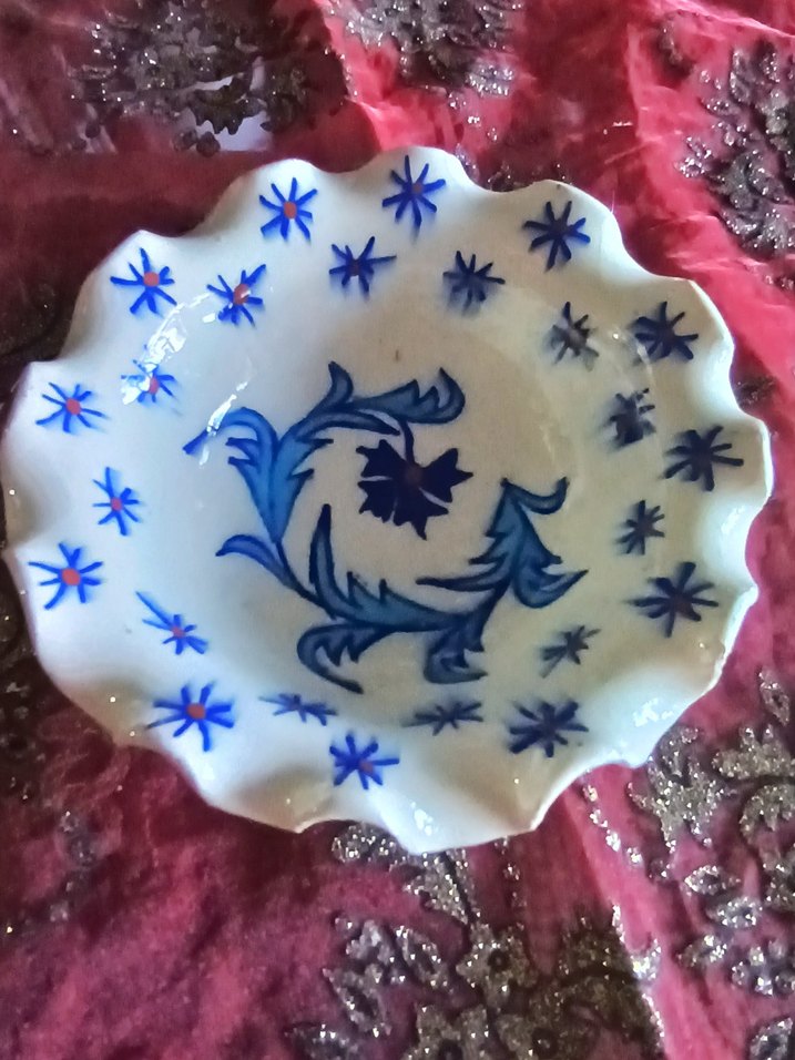 Vintage,dalgalı kenarlı, mavi çiçek desenli geleneksel tabak.