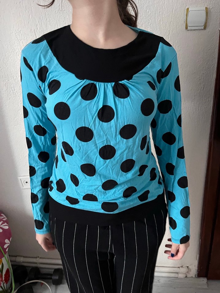 Vintage Mavi Puantiyeli Uzun Kollu Bluz