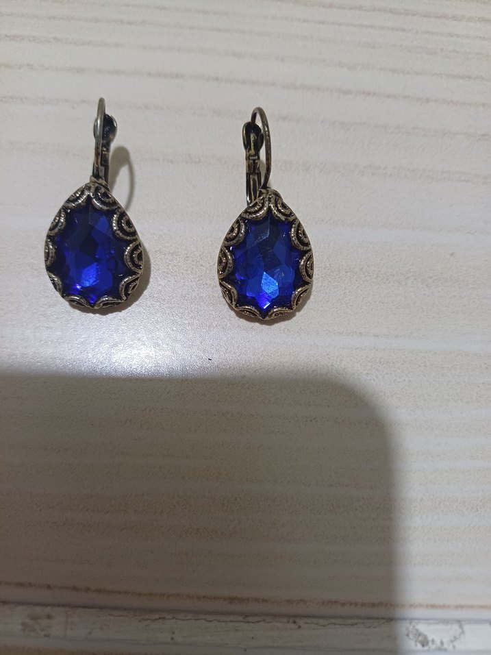 Vintage tarzda, koyu mavi taşlı, işlemeli ve payet detaylı midi uzunlukta küpeler. Düğün ve bohem tarz için uygun.
