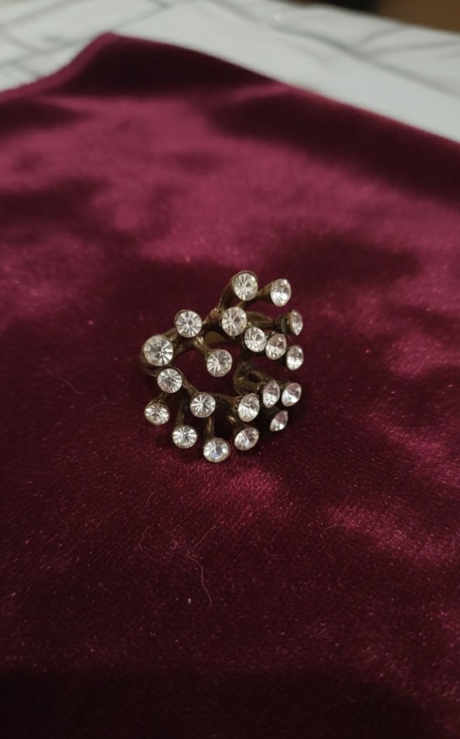 Vintage tarzda, parlak payetler ve işlemeli detaylara sahip, gotik dokunuşlu mercan taşlı yüzük