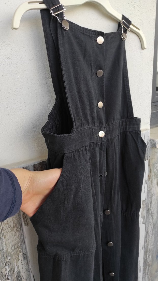 Düğmeli detaylara sahip siyah jile, yüksek yakalı ve bol kesimdir. Uzun askılarıyla günlük rahat sokak stili için uygundur. Fotoğrafta göründüğü gibidir. Alana hayırlı olsun. #jile #elbise #kot #vintage