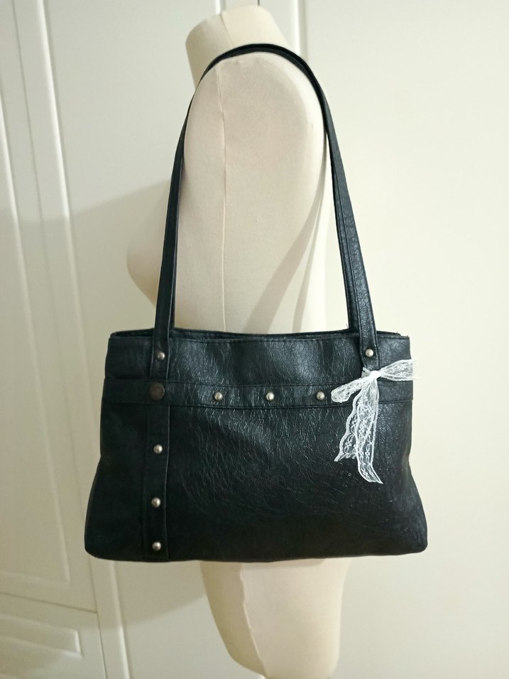 vintage metal zımbalı siyah deri kadın çanta, kemer detaylı ve hafif dantel fiyonk detayıyla günlük kullanım için uygun gotik Paris tarzında. çift gözlü olup kullanışlıdır