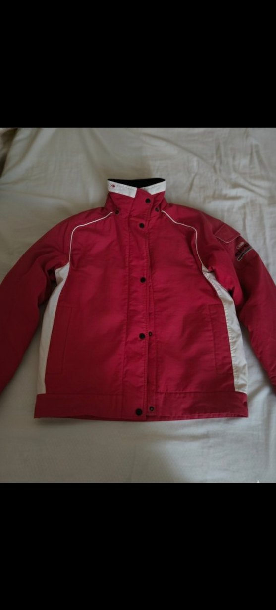 kırmızı renkte, düğmeli ve yakalı, uzun kollu, normal midi uzunlukta kadın ceket. Beyaz yan detaylı, spor ve günlük şık tarzda dış mekan kullanımı için uygun. içinde biraz tüylenme var fiyata yansittim