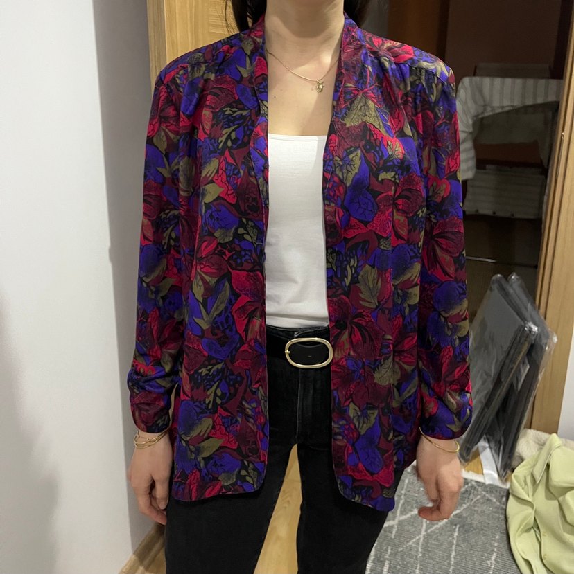 Salaş kesim, düğmeli, uzun kollu, yakası kesimli ceket. Mor tonlarında tie-dye desenli, yumuşak sentetik kumaştan günlük kullanıma uygun. Bir adet düğmesi kopuktur.