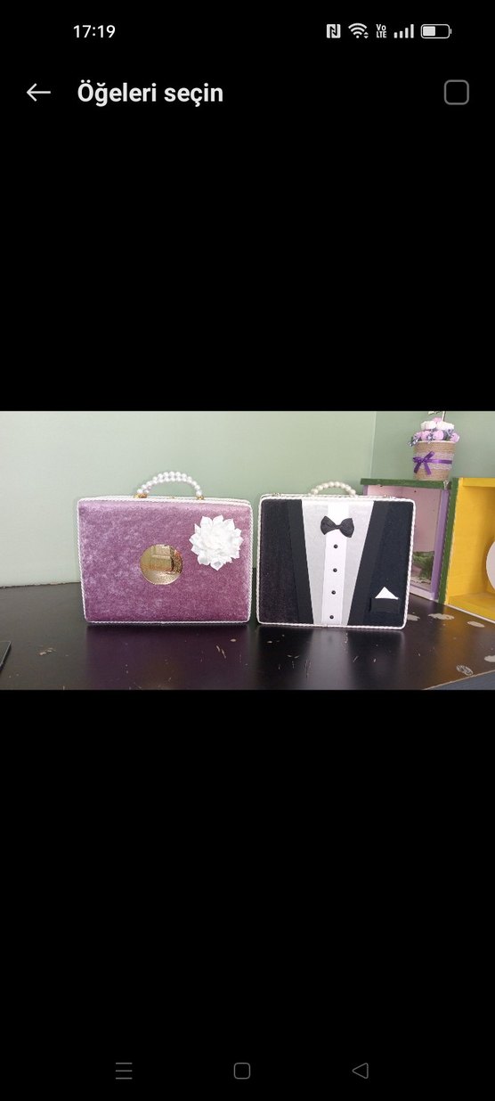 Vintage tarzda mor mini tuxedo çanta, düğmeli, yakalı ve askılıdır. Düğünler için inci saplı, düzenli kesimdir. nişan için gelin damat kuran seti Hayrat neşriyat gelin damat seti olarak alındı