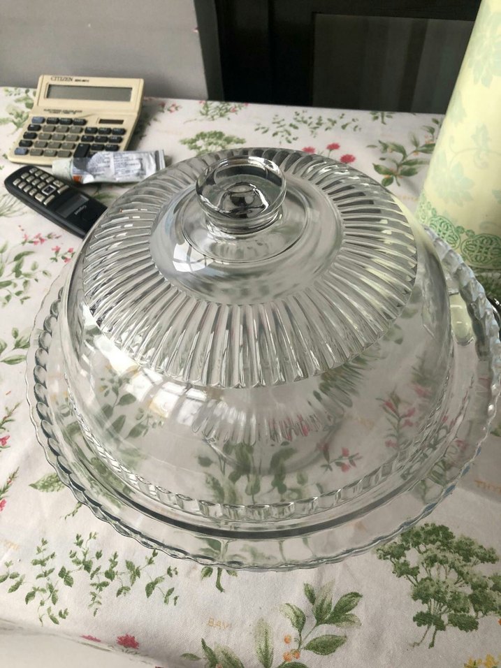 Vintage tarzda, nakış desenli beyaz kumaş üzerine yerleştirilmiş cam servis tabağı ve şeffaf cam kapak. Sofralarınıza şıklık katar. ️ vintage kek fanusu 3 lu satis elden tertemiz yen gibi