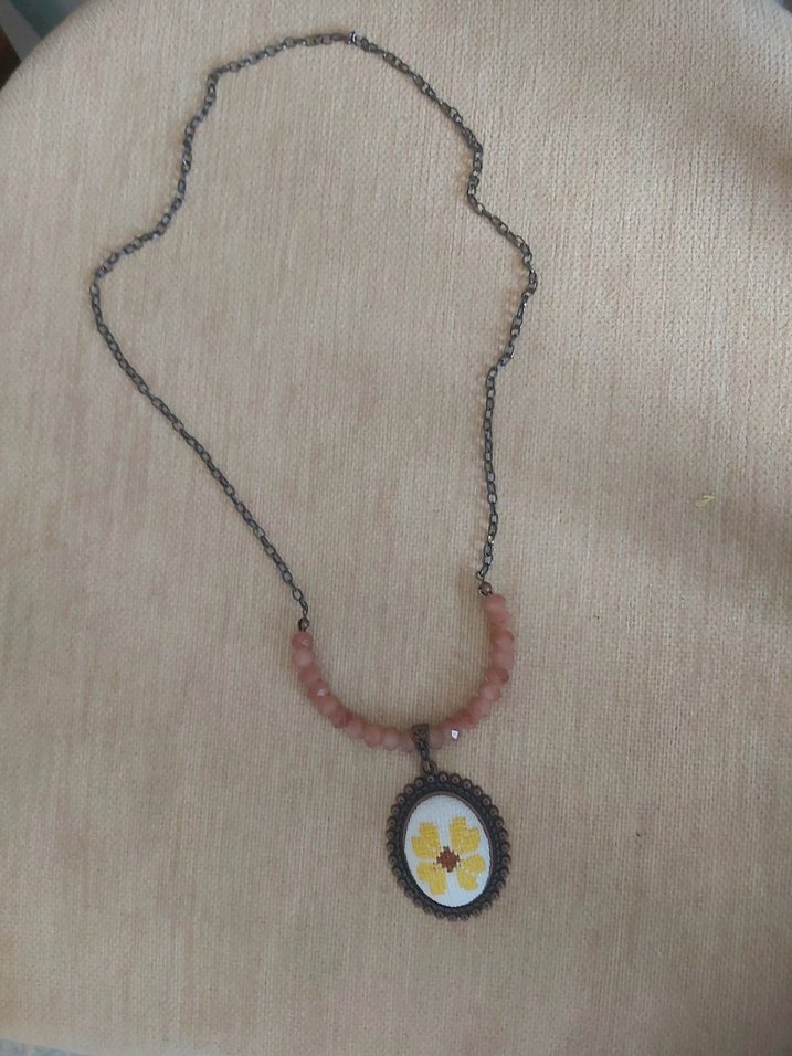 Bu bohem tarz kolye, pastel boncuklar ve nakışlı vintage kolye ucu ile günlük kullanıma uygundur. Normal uzunlukta ve midi boydadır.