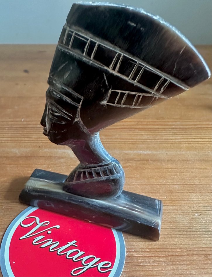 PAZARLIKSIZ…Vintage Antik Mısır’ın efsanevi kraliçesi Nefertiti’yi betimleyen, tamamen doğal bufalo boynuzundan elde oyulmuş özel bir figürdür. El işçiliğiyle şekillendirilmiş bu parça, doğal ton geçişleri ve detaylı oymasıyla dikkat çeker. Koleksiyonluk, masa üstü dekor veya anlamlı bir hediye olarak değerlendirilebilir. Yükseklik: 9,5 cm eni 7,8 cm dir Malzeme: Gerçek bufalo boynuzu Vintage, etnik ve tarih temalı objeler sevenler için benzersiz bir dekor.... #vintage #nadir #boynuz #doğal #dekoratif #figür #koleksiyon