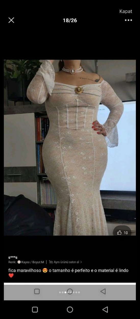 Dantel kumaştan, uzun ve vücuda oturan beyaz gelinlik. Kayık yaka ve ince askılı, klasik zarafet ve vintage bohem tarzı yansıtıyor.