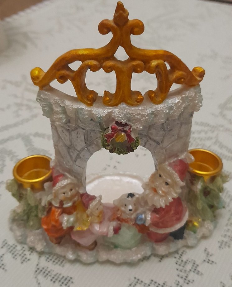 1990’lar – 2000 başı Avrupa / Çin üretimi Noel mumluklu dekoratif obje Malzemesi: Poliresin (taş tozu + reçine karışımı) Üzeri el boyaması Mum yuvaları metal (alüminyum / pirinç kaplama) detaylı, Noel Baba, çocuklar ve kardan adam figürlü renkli Noel süsü ve mumluk.