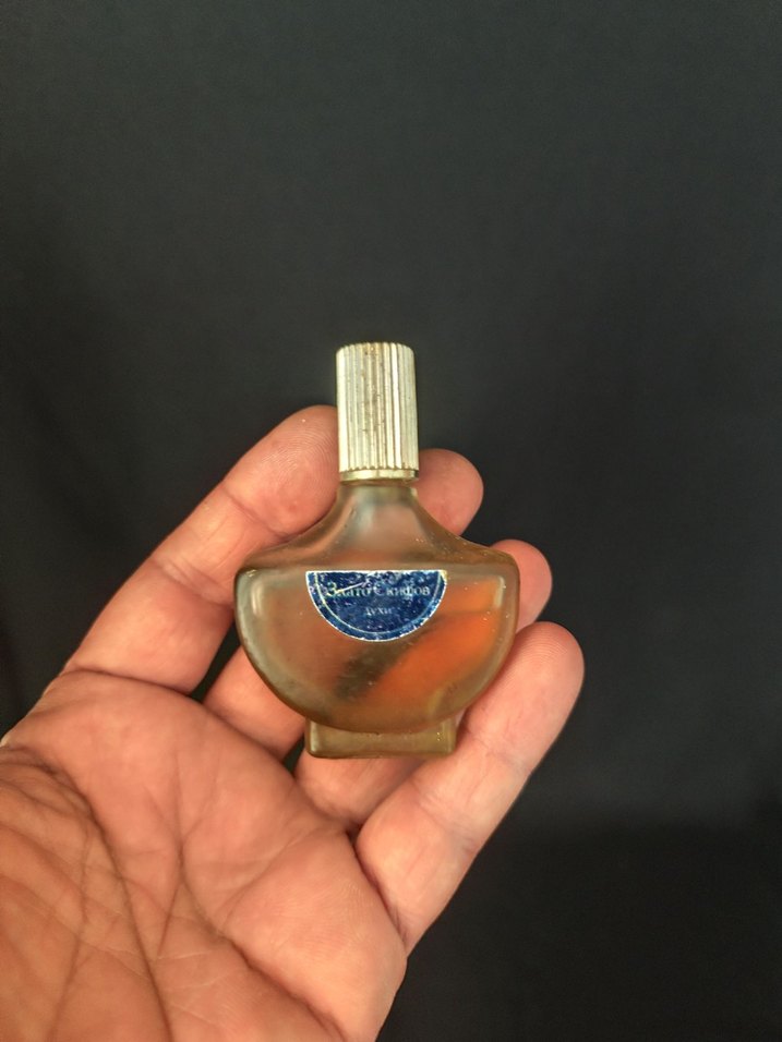 Vintage Novaya Zarya İskit Altın Küçük, vintage kadın parfüm şişesi, kabartmalı gümüş kapak ve solmuş mavi etiketle, yaşlanma izleri taşıyor.