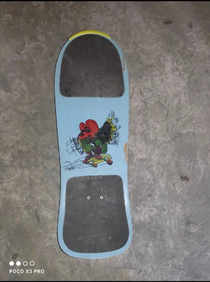 Bu ürün, 80'ler veya 90'lar dönemine ait olduğu tahmin edilen, eski tip bir kaykaydır. Hem nostalji sevenler hem de retro/vintage dekorasyon düşünenler için harika bir parçadır. ✨ Özellikler ve Durumu: Tip: Old-School (Eski tip) kalın deck yapısı. Grafik: Üzerinde yıpranmış durumda, çizgi film tarzı bir karakter grafiği bulunmaktadır. Renk: Mavi (gökyüzü mavisi tonlarında). Kullanım Durumu: Kaykay yaşına göre genel olarak sağlamdır ancak yoğun kullanıma bağlı yıpranmalar mevcuttur (Grip tape aşınması, grafik soyulmaları, tahta kenarlarında izler). Dingiller (trucks) ve tekerlekler de kullanılmıştır. Not: Genellikle dekoratif amaçlı veya koleksiyon amaçlı sergilenmesi tavsiye edilir. Sürüş performansı garantisi verilmemektedir. Lütfen Dikkat: Detaylı durum için tüm fotoğrafları inceleyiniz. Ürünün markası bilinmemektedir.