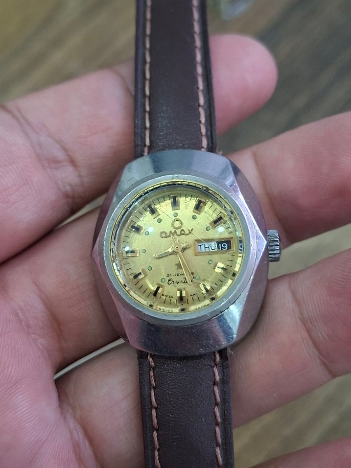 Tamamen orjinal 1980ler Otomatik pilsiz çalışan saat İsviçre üretimi Deri kordon Kendi Orjinal kalın cam Nostaljik ve antika sevenler için Altın renkli kadran, gün ve tarih göstergeli vintage Omax erkek kol saati; gümüş renk kasası ve kahverengi deri kayışı ile.