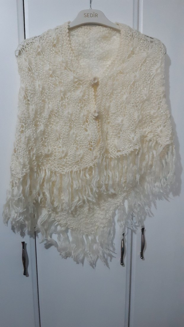Bu beyaz kadın şalı, örgü detayları ve püsküllü kenarları ile rahat ve bohem bir tarz sunar.