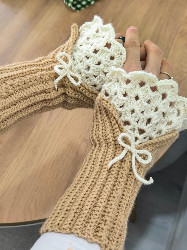 Bej renkte, dantel detaylı ve fiyonk süslemeli örgü eldiven. Yumuşak ve rahat, bohem ve retro tarzı için uygun.