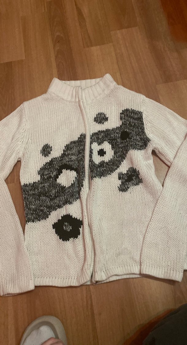 Boğazlı, uzun kollu ve baskılı desenli, kızlar için örme, beyaz ve gri kazak. Trend sokak stili için uygun. fermuari bozuk.