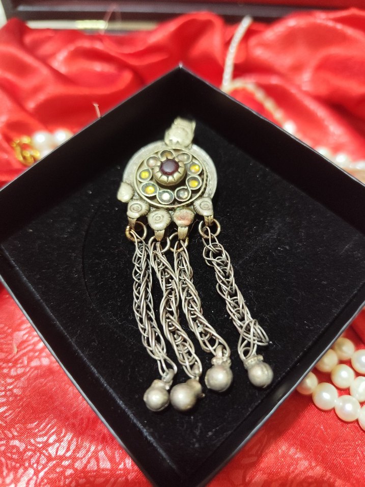 Bohem tarzı otantik alpaka Osmanlı eski kolye ucu iki taraflı kullanılabiliyor ayrı desenler var Renkli işlemeli detaylara ve püsküllere sahip, günlük kullanıma uygun bohem kadın kolye ucu. Bej tabanlı, zincir ve boncuk süslemelidir.
