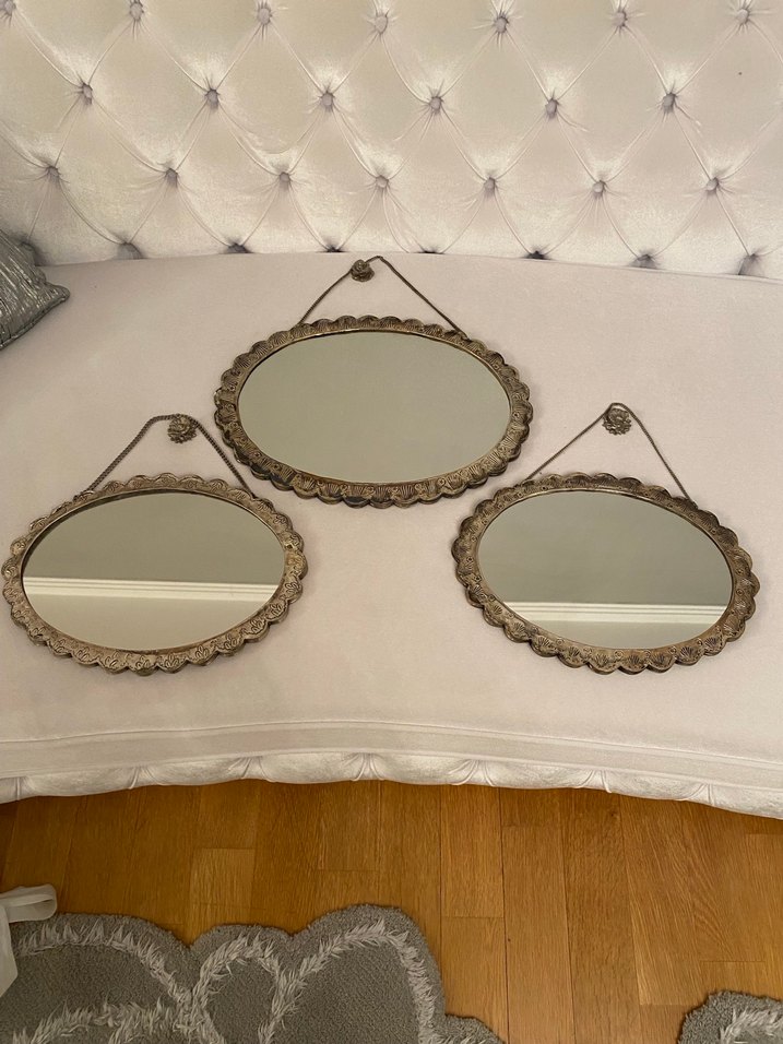 900 ayar gümüş Dekoratif çerçeveli, zincir askılı üçlü vintage oval duvar aynası seti. Klasik bir dokunuş sağlar.