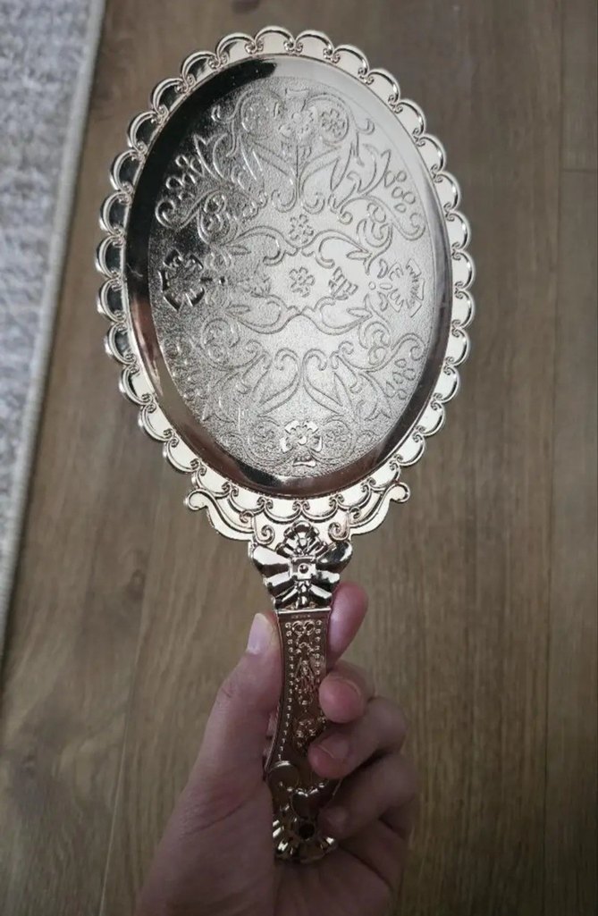 Karmaşık desenlere ve süslü sapına sahip parlak altın renkli elde tutulan ayna. Ayrıntılı yansıtma için uygundur. hiç kullanılmadı
