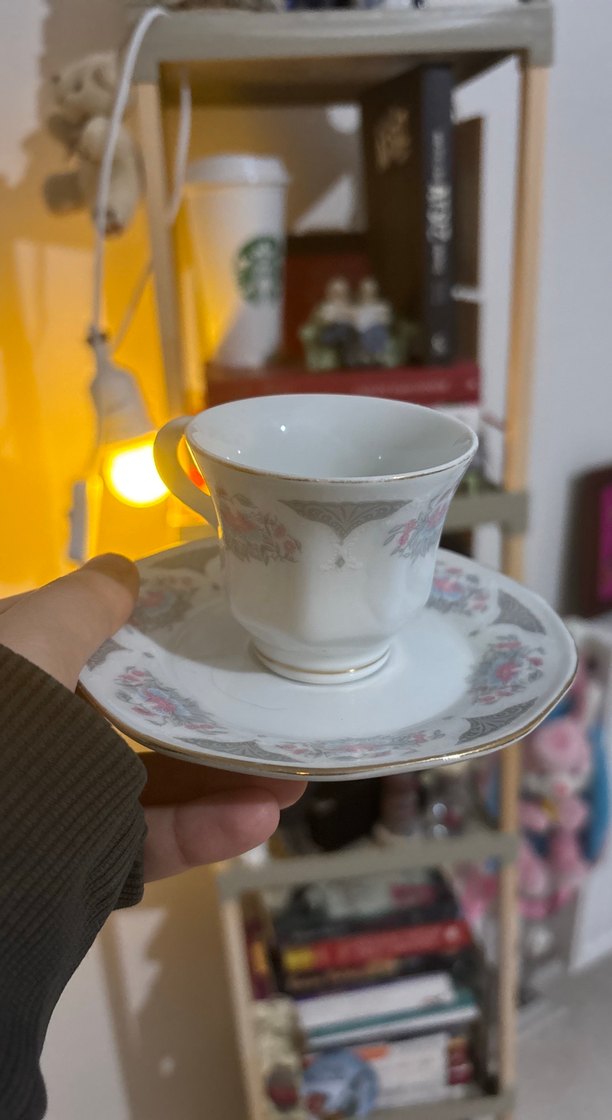 Gri çiçek desenli beyaz porselen fincan ve tabağı, klasik ve zarif bir tasarıma sahiptir. Çay veya kahve için uygundur. ☕ dört bardak ve tabak fiyatıdır Tayland ürünüdür,vintage parçamdır.