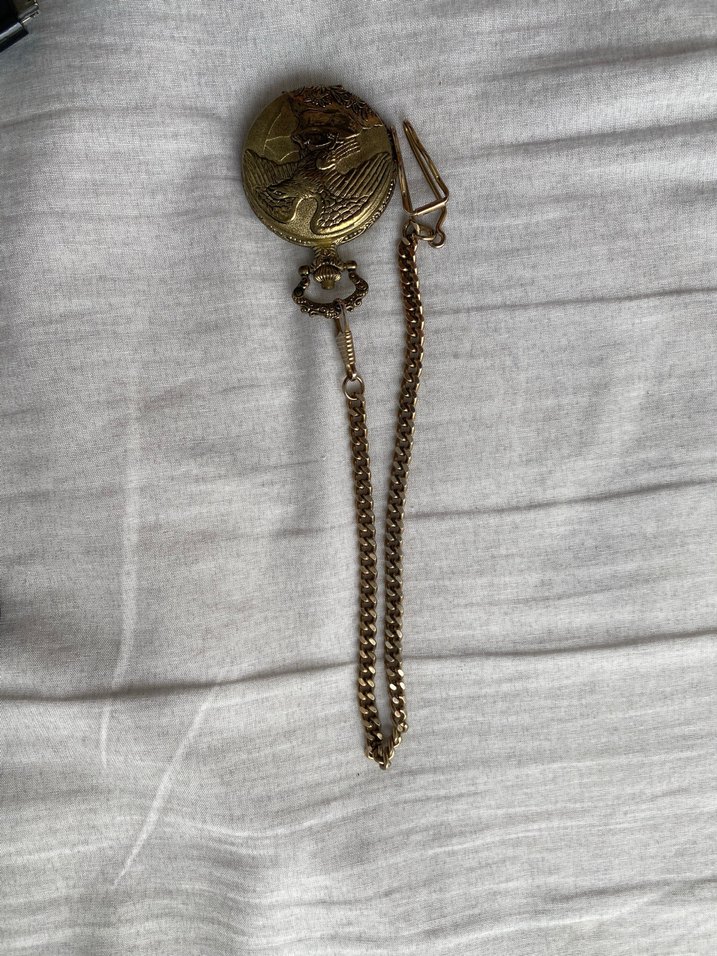 Parlak altın renkli, detaylı kartal figürlü vintage erkek cep saati ve zinciri. Çalışıp çalışmadığını bilmiyorum