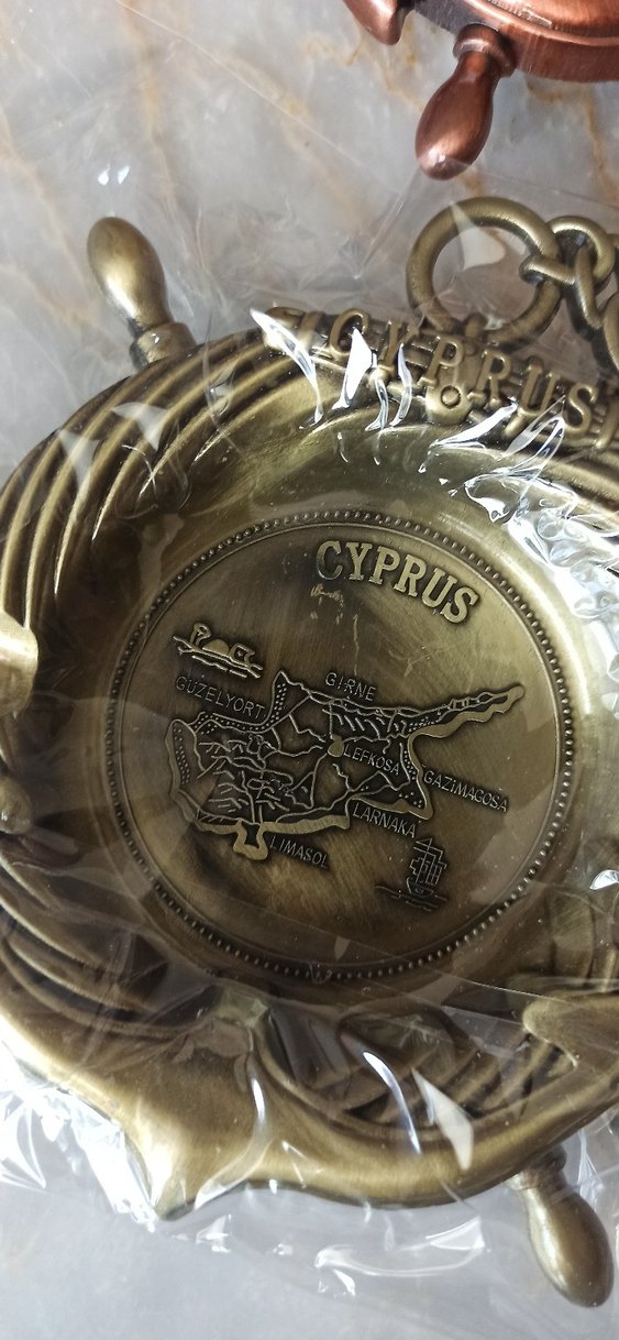 Parlak altın renkte, Kıbrıs haritası ve şehir isimlerini içeren vintage tarzda Demir döküm kül tablası